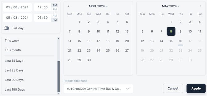 By default, the Call log shows all calls for the past 7 days (today + 6 past days) listed chronologically, with the most recent messages at the top. You can specify the dates & time for the listed message as well as the timezone solely to show in the report.