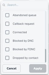 You can filter the calls displayed in the Call log by different parameters: Direction, Result, Business number, Employee, Workgroup, Campaign, System Disposition & Agent Disposition.
