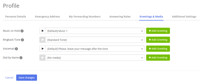 Here you can add, edit and remove your recorded greetings, music on hold, ringback tones, and voicemail instructions, as well as upload your own greeting for the Dial by Name feature.