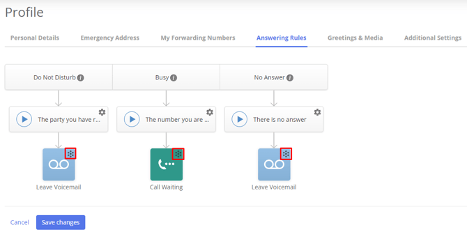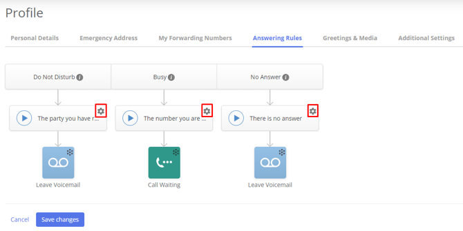 This presence status can be used to define how your incoming calls will be handled in Profile → Answering Rules. First, an audio recording will be played (it can be disabled by clicking on the gear icon in the upper right corner of a greeting block):