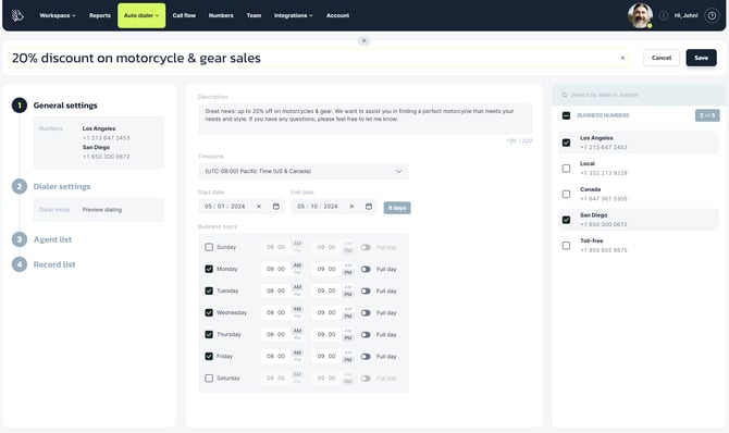 When creating a campaign, it's possible to schedule a specific start & end date for it, as well as specify the hours during which the campaign calls will be made.